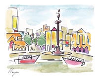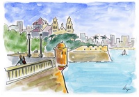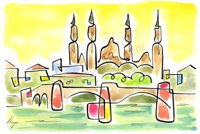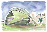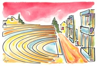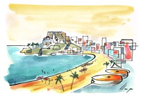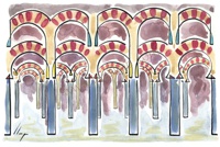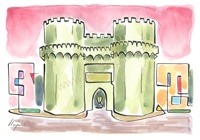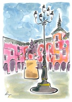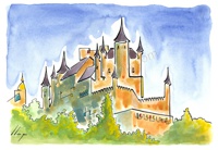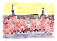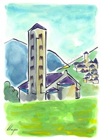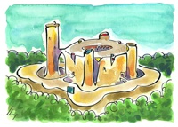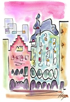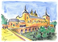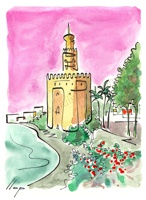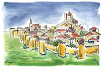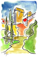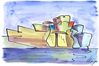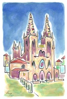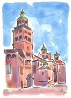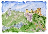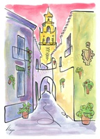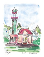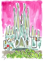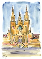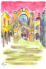Vist el potencial d'aquestes estampacions, vaig anar fent tota una sèrie de dibuixos a canya i tinta xinesa, il·luminats amb aquarel·les, sobre monuments de Catalunya i resta d'Espanya. També fets amb la juguesca de la "línia continua", per digitalitzar i estampar amb electrografies 30x21. La sèrie ni molt menys està acabada, però ara mateix estic amb altres projectes. |