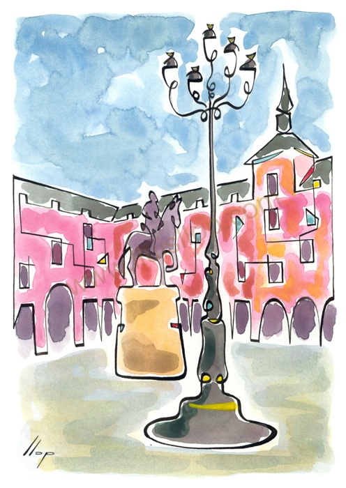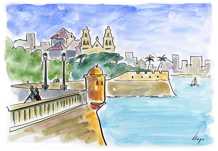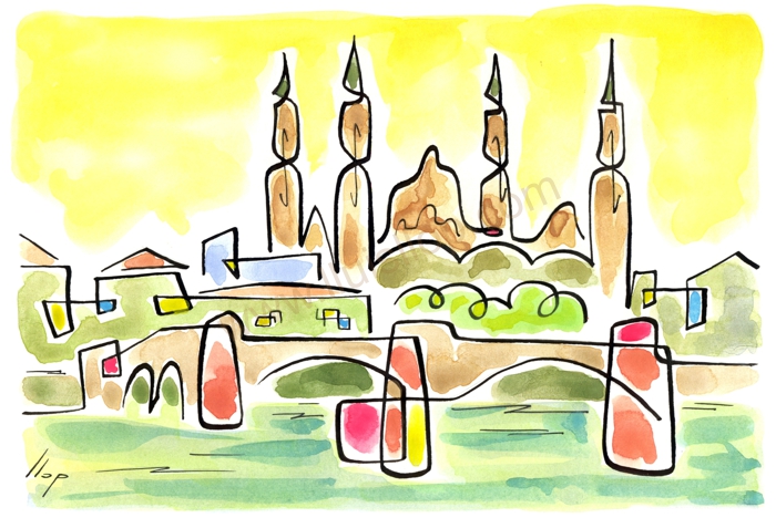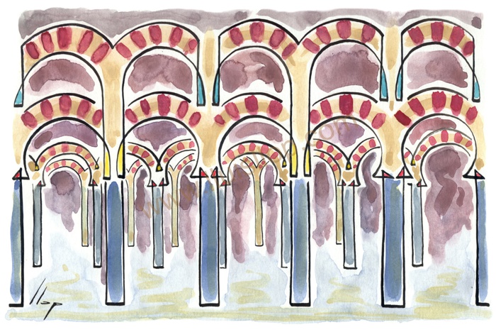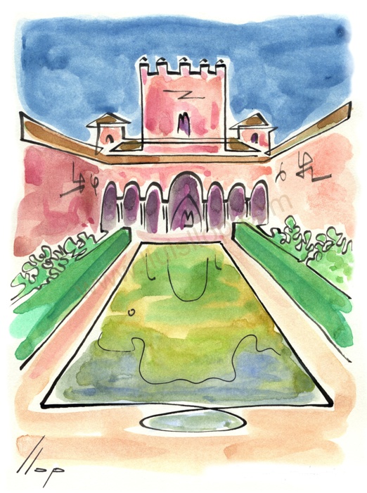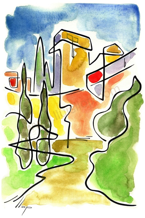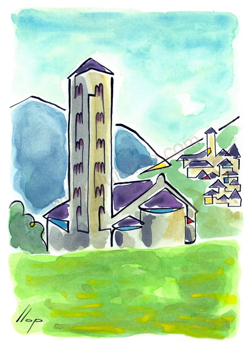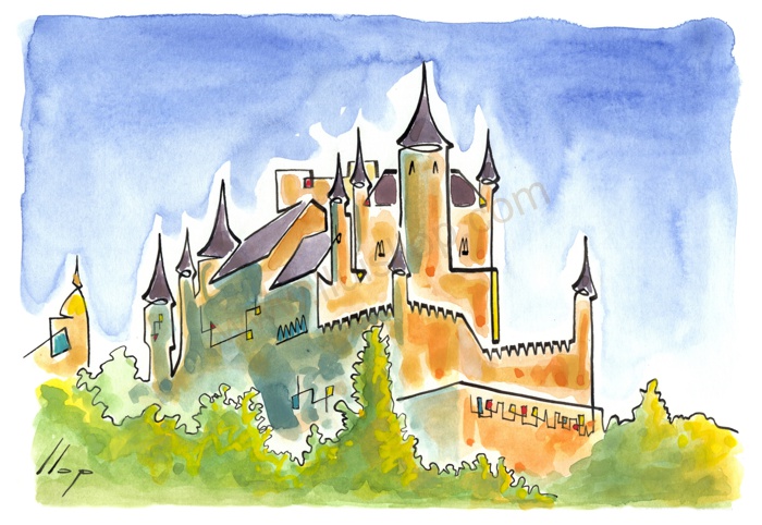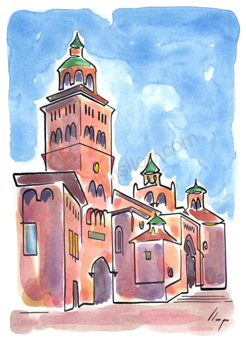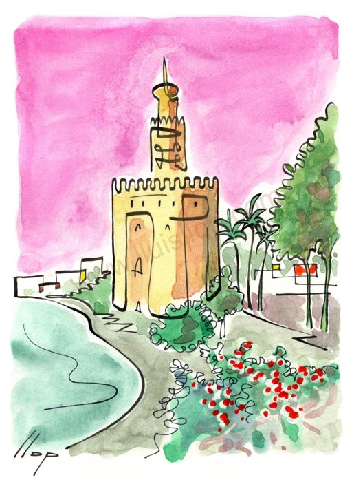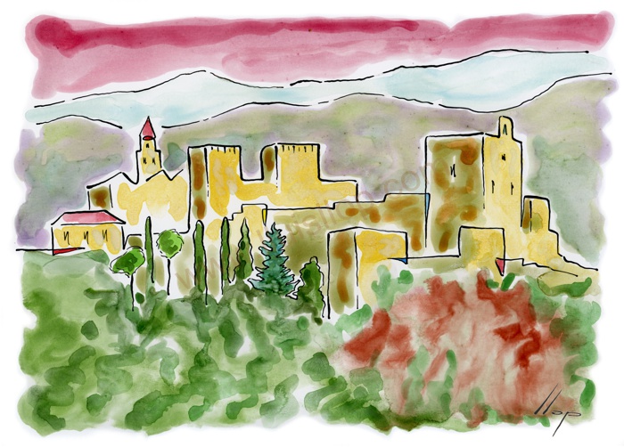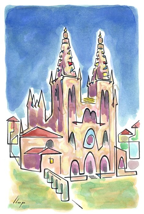 Vist el potencial d'aquestes estampacions, vaig anar fent tota una sèrie de dibuixos a canya i tinta xinesa, il·luminats amb aquarel·les, sobre monuments de Catalunya i resta d'Espanya. També fets amb la juguesca de la "línia continua", per digitalitzar i estampar amb electrografies 30x21. La sèrie ni molt menys està acabada, però ara mateix estic amb altres projectes. |